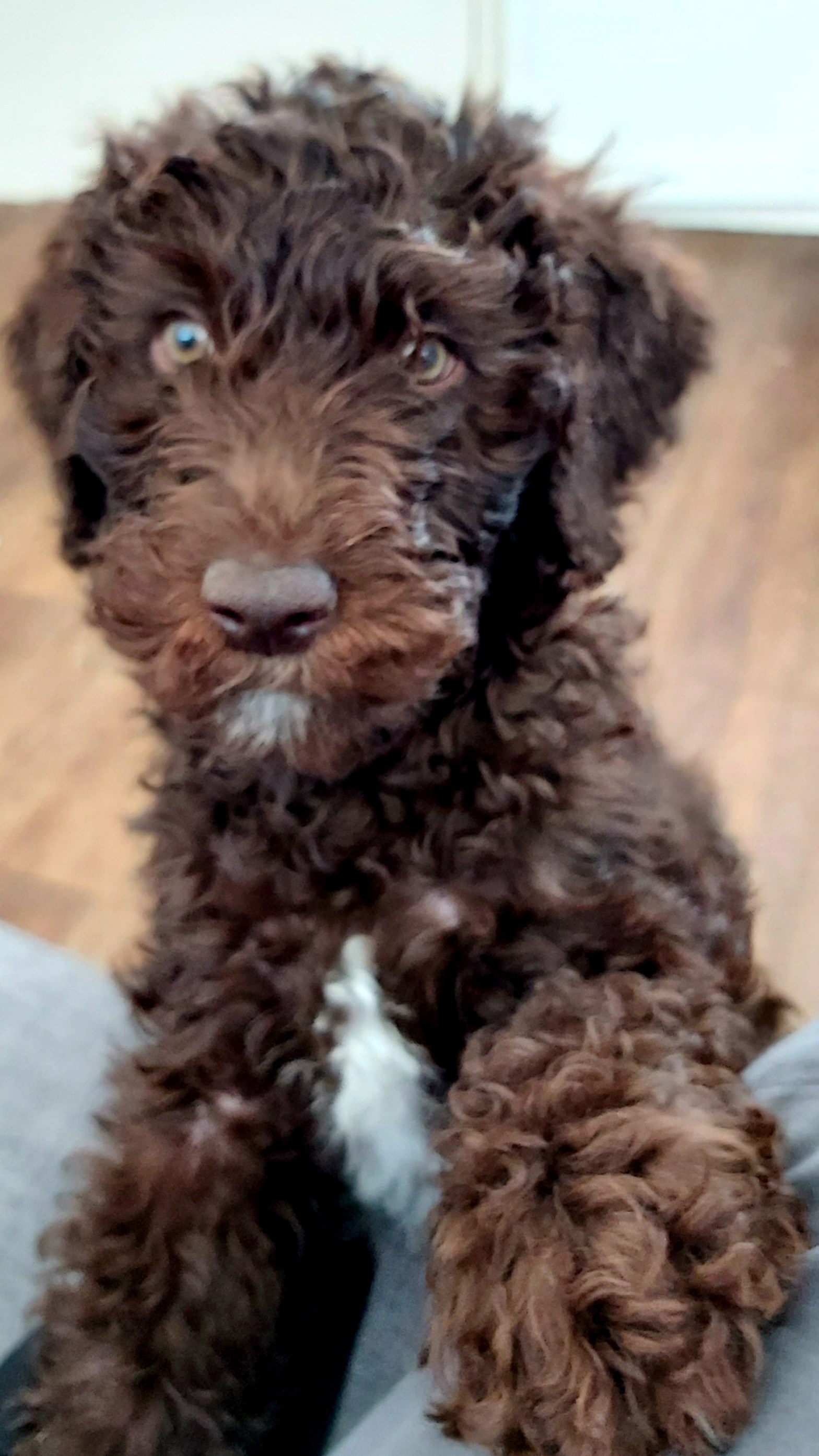 En ja hoor. Bingo! Op 12 februari is er een nestje geboren met zeven kleine labradoodletjes. Niet te ver van huis, zodat de jonge pup niet meteen een wereldreis hoeft te maken op zijn eerste dag weg van moeders. We bezoeken moeder labradoodle met haar pups en zijn op slag verliefd op een prachtige kleine pup: bruin met een wit befje. De oogjes nog dicht, de pup is zo lief. Met een mooi dik vachtje met een kleine slag erin. Dat moet wel een prachtige hond gaan worden.