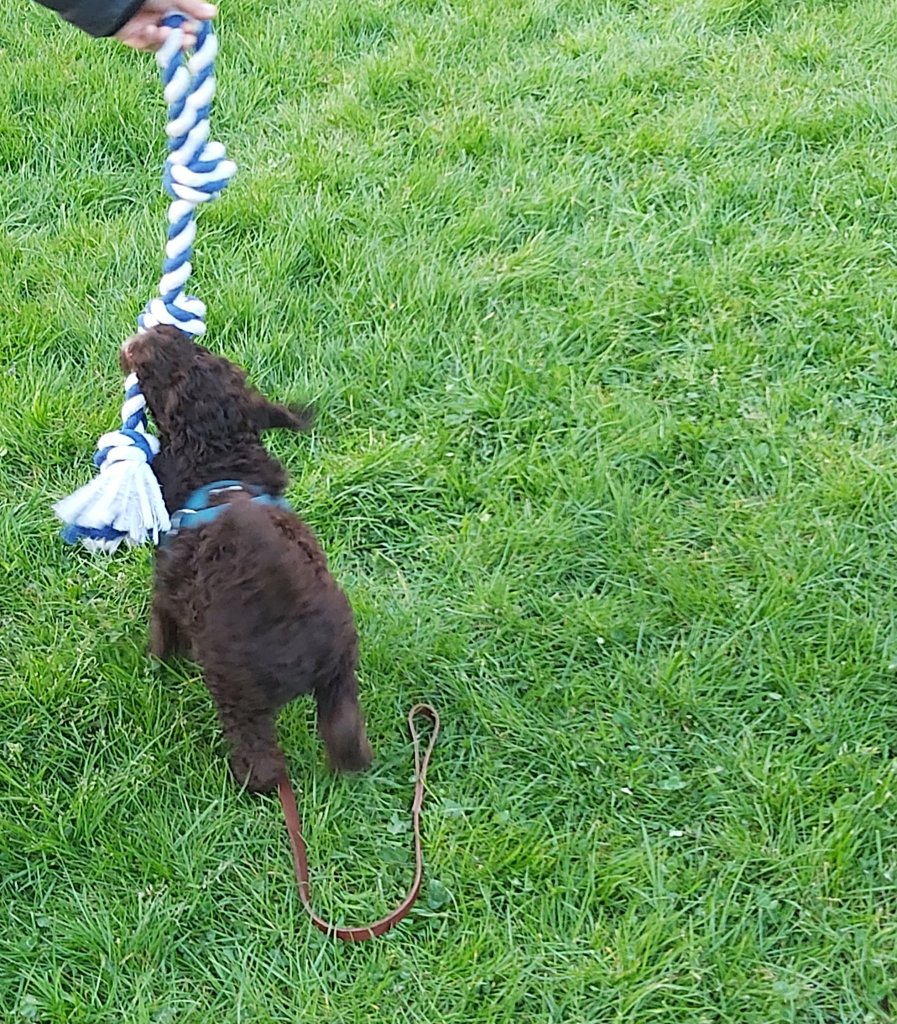 De daarop volgende dagen leert Monty allerlei spelletjes. Zo mag hij stoeien met de flos om dan na het commando Los! meteen los te laten. Dat gaat goed. We maken het moeilijker. Stoeien, Los en dan meteen Laag. Ook dat lukt. Net als Zit en Blijf. Het lopen aan de riem lukt ook al aardig. Hoewel Monty nog geen vaste kant heeft waar hij loopt, staat de riem maar zelden gespannen. Heel knap voor een hondje van negen weken!