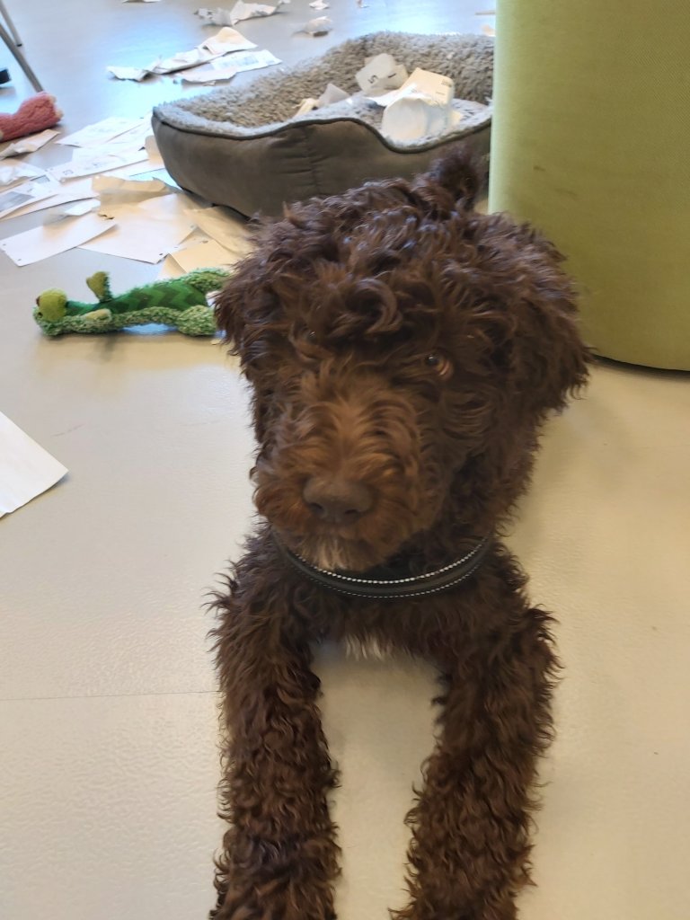 Monty, wat zal je baasje trots zijn als ze je rapport leest! Je bent wel heel hard gegroeid, maar nog steeds een jong hondje. Nog maar negen maanden oud. Heel knap dat je nu al zoveel kan. Met leerlingen wandelen, ondersteunen in de mediatheek, de collega’s vermaken en bovenal kroelen met de leerlingen.