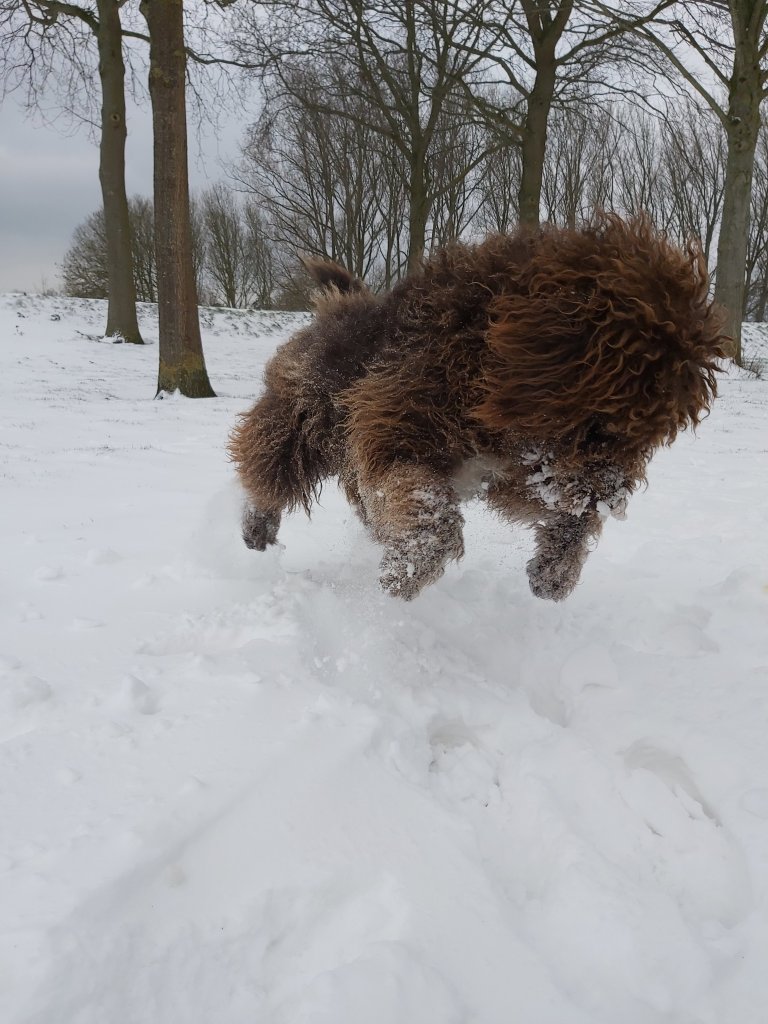 Het is nog maar een week geleden dat Monty het plezier van krakend ijs ontdekt. Als het ’s nachts flink gevroren heeft stappen we in de auto. Op weg naar het bos. Daar barst het van de bevroren plassen, nog helemaal intact. Wat een feest om hierop te springen en te horen hoe het ijs kraakt. En kleine stukken ijs af te breken. Monty is weer even helemaal puppy, door het dolle heen!