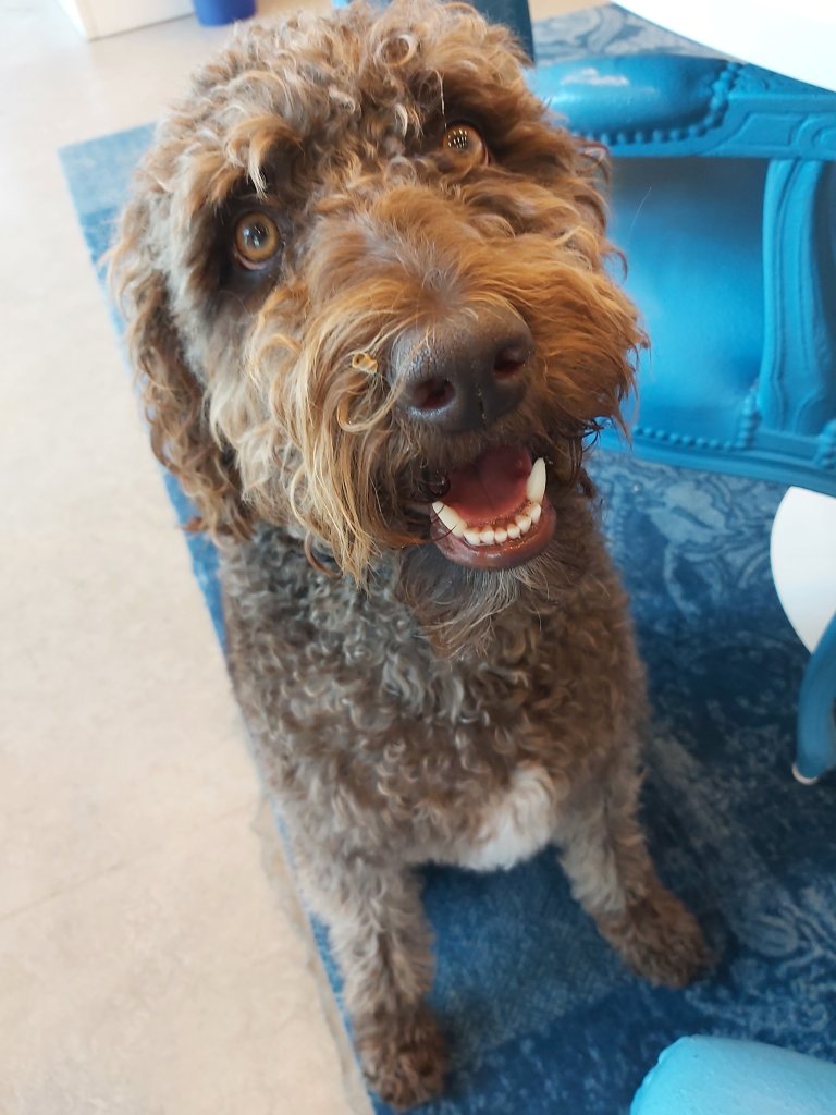 Gelukkig zijn er nog meer versoepelingen doorgevoerd: de kappers mogen weer open! En dat is maar nét op tijd voor Monty. Boven op zijn koppie zagen we inmiddels een oerwoud van wilde dreadlocks ontstaan. Als we iets langer hadden gewacht, was de schaar niet voldoende meer geweest. Dan had de tondeuse de klus mogen klaren. We nemen afscheid van zijn coupedecorona. Gedurende ruim vijf uur wordt Monty onder handen genomen: geborsteld, gewassen, gedroogd, geknipt, oortjes en nageltjes nagekeken… Ik tref een tip top hondje aan die avond. Het is even wennen, zo zonder zijn lange lokken, maar het blijft Monty. Even lief en nu zelfs nog zachter, nog meer een knuffelhondje!
